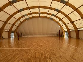 Inaugurata la nuova palestra dell’Istituto. Palestra di 900 metri quadrati. Struttura portante in legno con copertura in telo PVC a doppia membrana